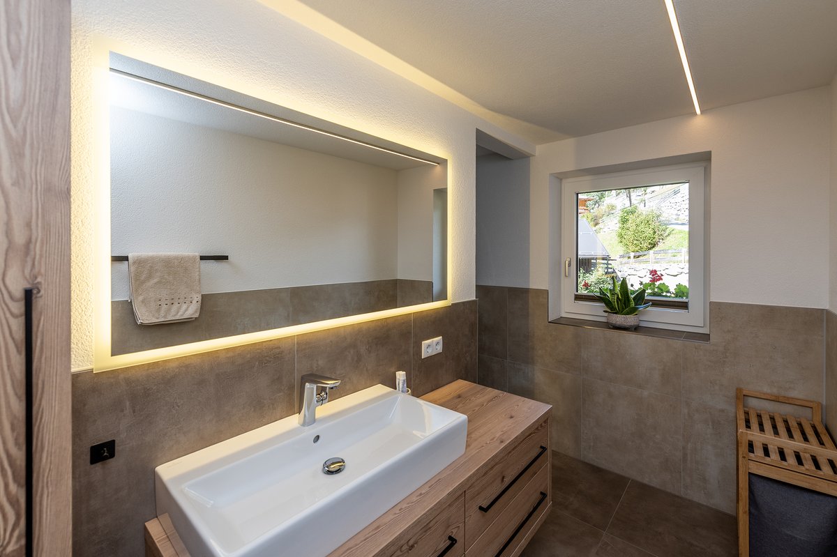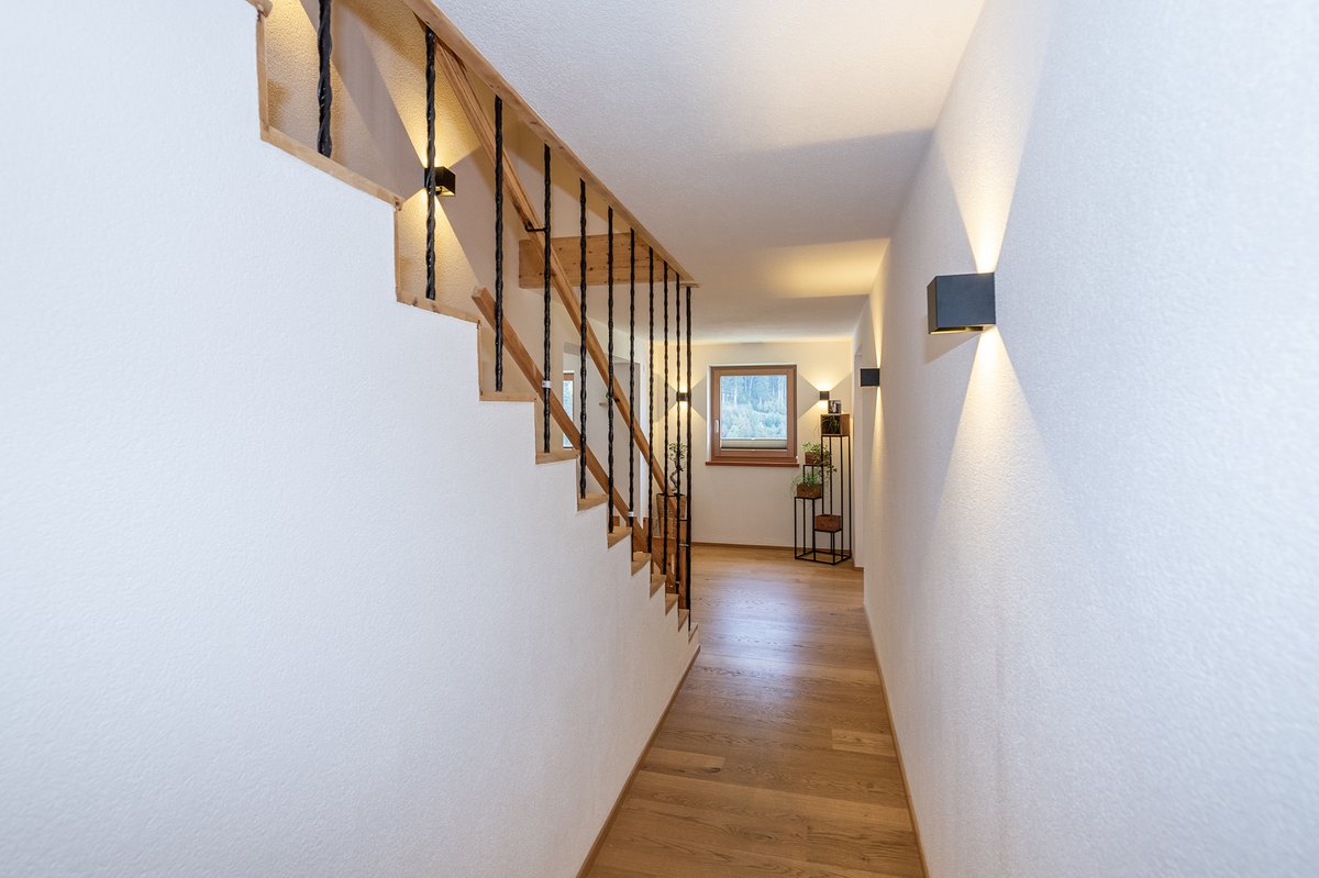 Der Innenausbau erfolgt im Massivbauteil und im Stadelteil mittels Holzständerwänden, es folgte das Ausdämmen der Holzriegelkonstruktion des Stadels inkl. der Installationsebenen und ein Fenstertausch. Die Hauswandfassade wurde mit 14cm Dämmung versehen, die Heizung blieb bestehen, da die Holzvergaserheizung ausreichend groß dimensioniert ist. Die Raumeinteilung sowie die Fußböden wurden gemäß den Wünschen der Bauherren erneuert.
